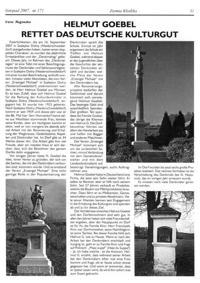 Helmut Goebel aus Niederschwedeldorf in der Grafschaft Glatz (Schlesien) wurde als „ehrenamtlicher Denkmalpfleger“ für den 43. Kulturpreis Schlesien des Landes Niedersachsen 2019 nominiert. Die Preisverleihung fand am 28. September 2019 im Lessingtheater in Wolfenbüttel statt.