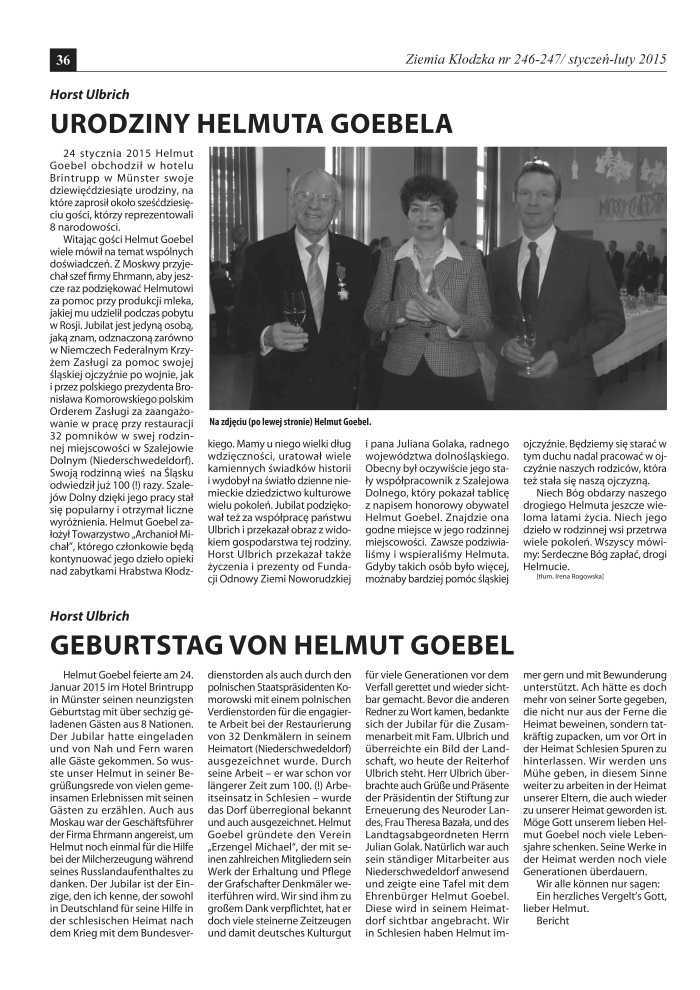 Helmut Goebels zahlreichen Verdienste für die Grafschaft Glatz und Ehrungen sollen in Beispielen u.a. durch Artikel über ihn in dieser Website der Grafschaft Glatz (Schlesien) dargestellt werden.