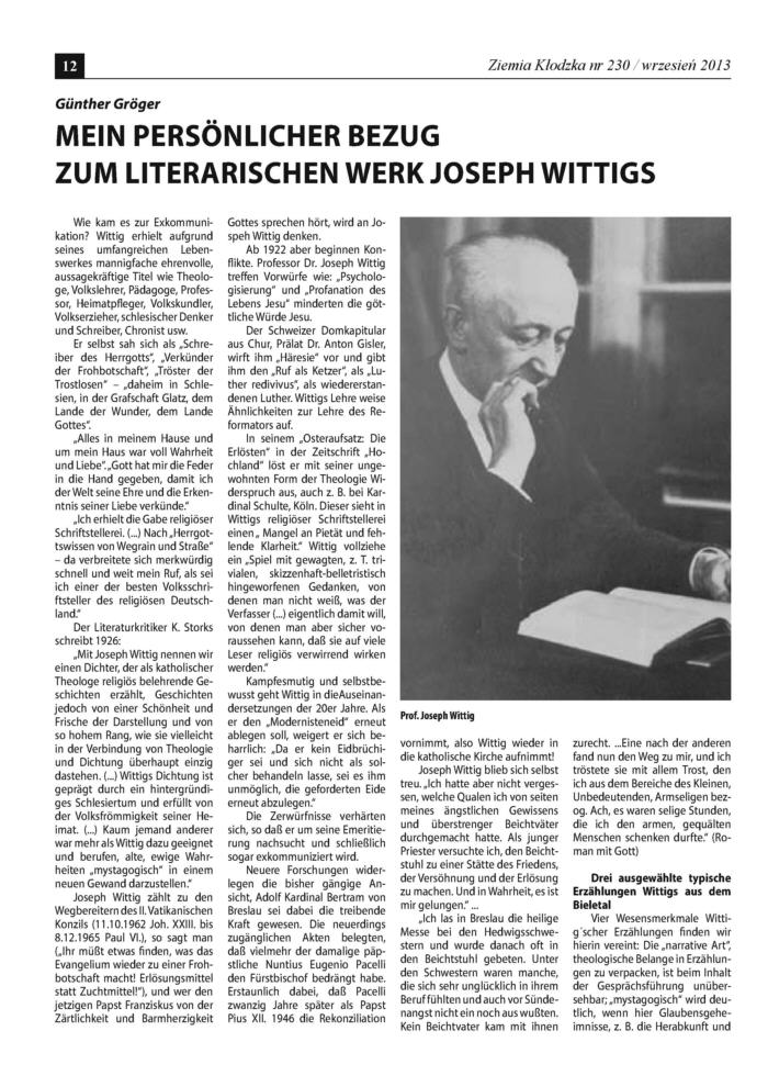 - Arno Herzig: Joseph Wittig und die Geschichte des Glatzer Landes