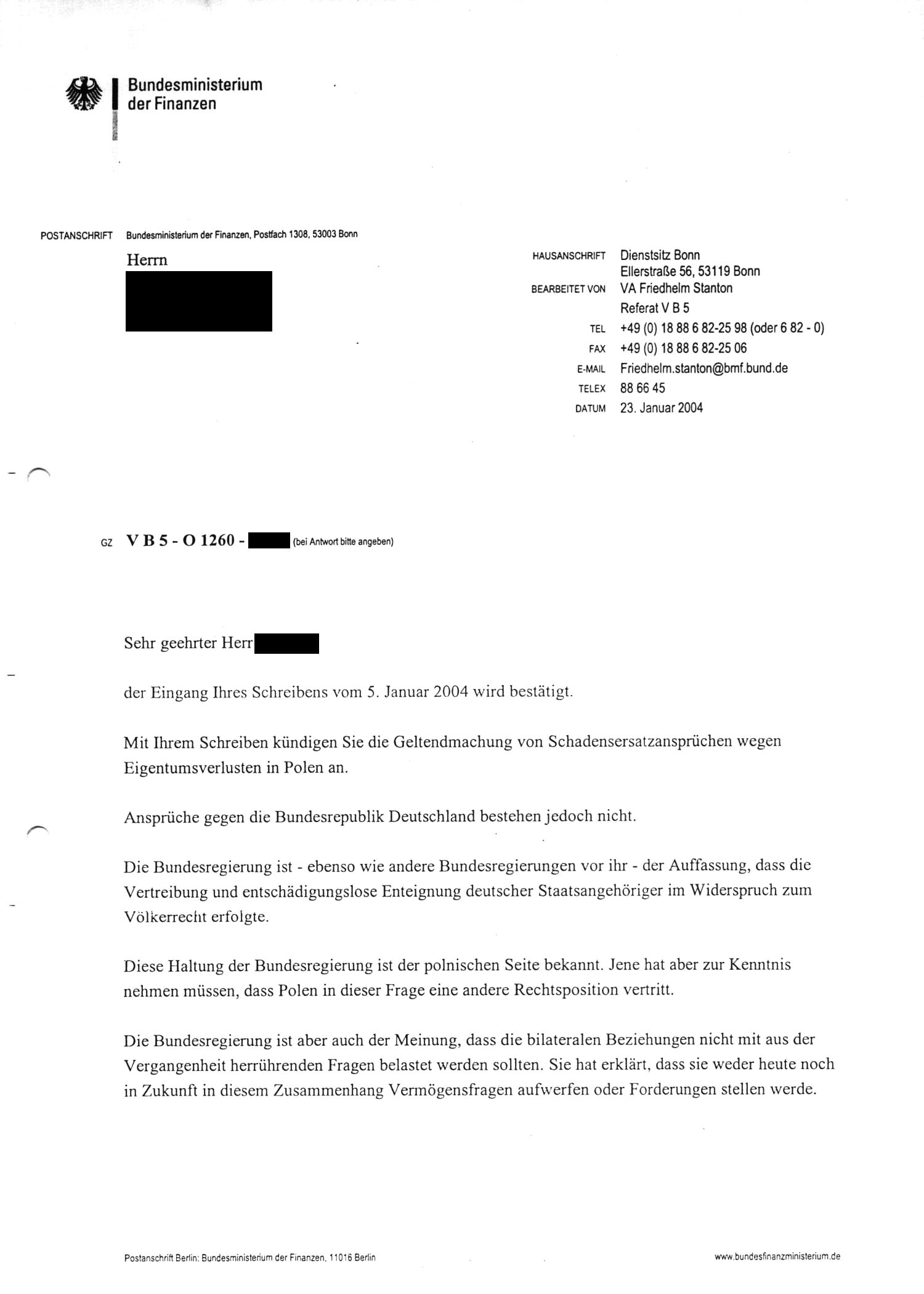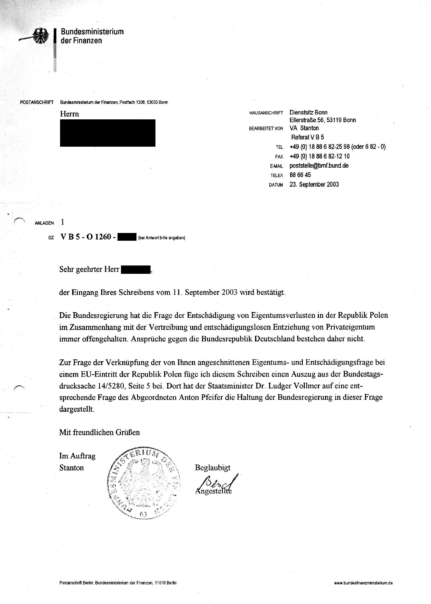 Musterbrief vom 08.11.2003 an das |