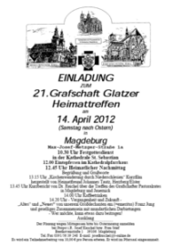 Seit 21 Jahren gibt es das inzwischen zur Tradition gewordene „Grafschaft Glatzer Heimattreffen in Magdeburg“. Im vorigen Jahr wurden beim 20. Treffen die Teilnehmer, die ja inzwischen nicht mehr „zu den Jüngsten gehören“ gefragt, ob das 20. Treffen 2011 das letzte sein sollte. - Es kam die einhellige Bitte: Wir möchten uns weiter treffen solange es eben geht. Und noch geht es! Und so kommt hiermit die Einladung zum „21. Grafschaft Glatzer Heimattreffen“ am 14. April 2012 (Samstag nach Ostern)
