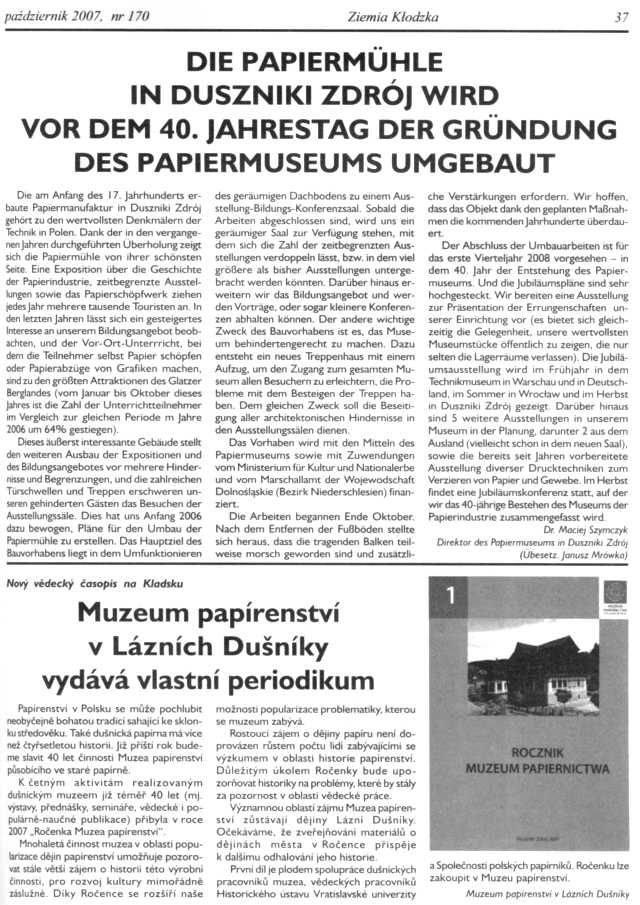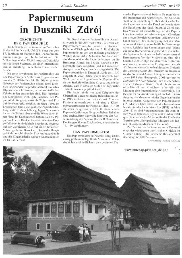 - Das Papiermuesum in Duszniki Zdrój ist der Träger des niederschlesischen Kulturpreises Silesia 2008
